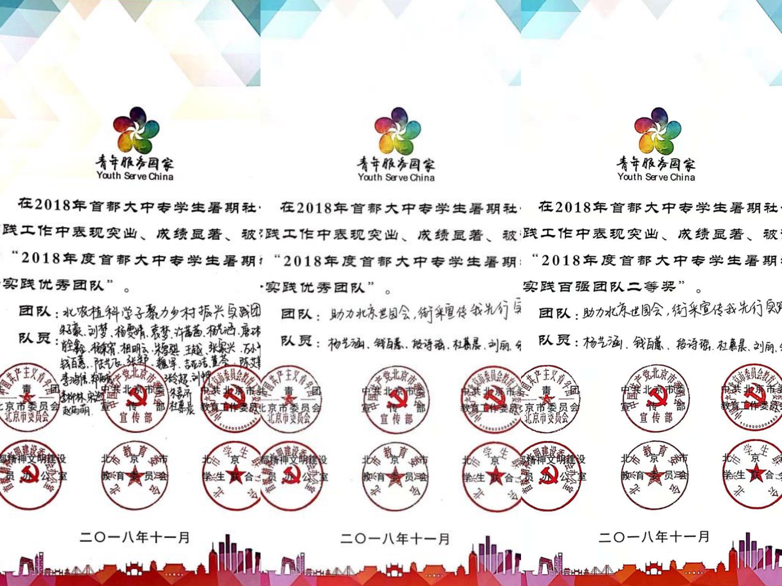 2018“青年服务国家”首都大中专学生暑期社会实践百强团队二等奖:williamhill“助力北京世园会,街采宣传我先行”实践团。