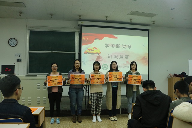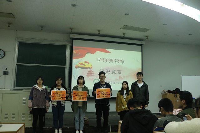 全体党课初级班学员参加了此次知识竞赛,活动共分为六个组,分别进行小组必答题、小组抢答题、小组风险题三个环节。在小组必答题环节,选手们沉着冷静地应答博得了台下同学阵阵掌声与喝彩;在小组抢答题环节,小组成员的默契配合、灵活的反应以及短时间作答的能力得以充分地体现;在小组风险题环节,各小组你追我赶,互不相让。比赛过程中,6组选手反应敏捷,对答如流,场上时常出现等比分状况,比赛异常激烈,精彩纷呈。最终,比赛决出3个团体奖和5个个人奖。党员同志为获奖的同学和团队颁发了奖品。