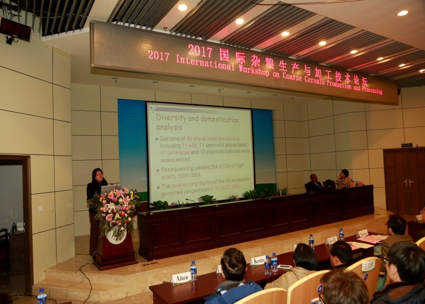 应大会组委会邀请,我院小豆团队在“2017International Workshop on Coarse Cereals Production and Processing(2017 WCCPP,2017国际杂粮生产与加工技术论坛)”做了题为“Mining onImportantly Agronomic Trait Genes of Germplasms Resourses and Improvement based genome in Adzuki Bean(基于基因组的小豆种质资源重要农艺性状基因挖掘和育种)”大会特邀报告。来自中国、美国、印度、日本和韩国等国的300多位中外杂粮研究专家和生产加工企业及研究生代表参会。