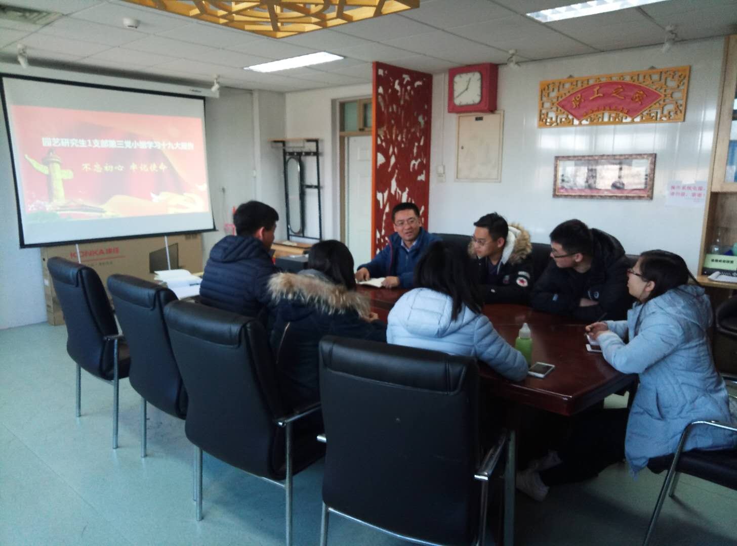 园艺研究生1支部现有38名学生党员,其中35名正式党员,3名预备党员。在党胜利召开十九大后,支部立即响应学校和学院学习十九大精神的号召,以党小组形式定期组织党员学习。每个党小组结合“学习十九大报告”的主线和自身党员专业特点,以不同方式认真学习,最大程度地调动各位党员的积极性。同时利用多媒体学习:组织支部党员同志关注微信公众号:“北京组工”、“学习小组”、“共产党员”和“团中央学习部”等线下学习十九大精神,同时支部委员和党小组组长不定期在支部学习群转发党的十九大精神以及最新党的理论知识。