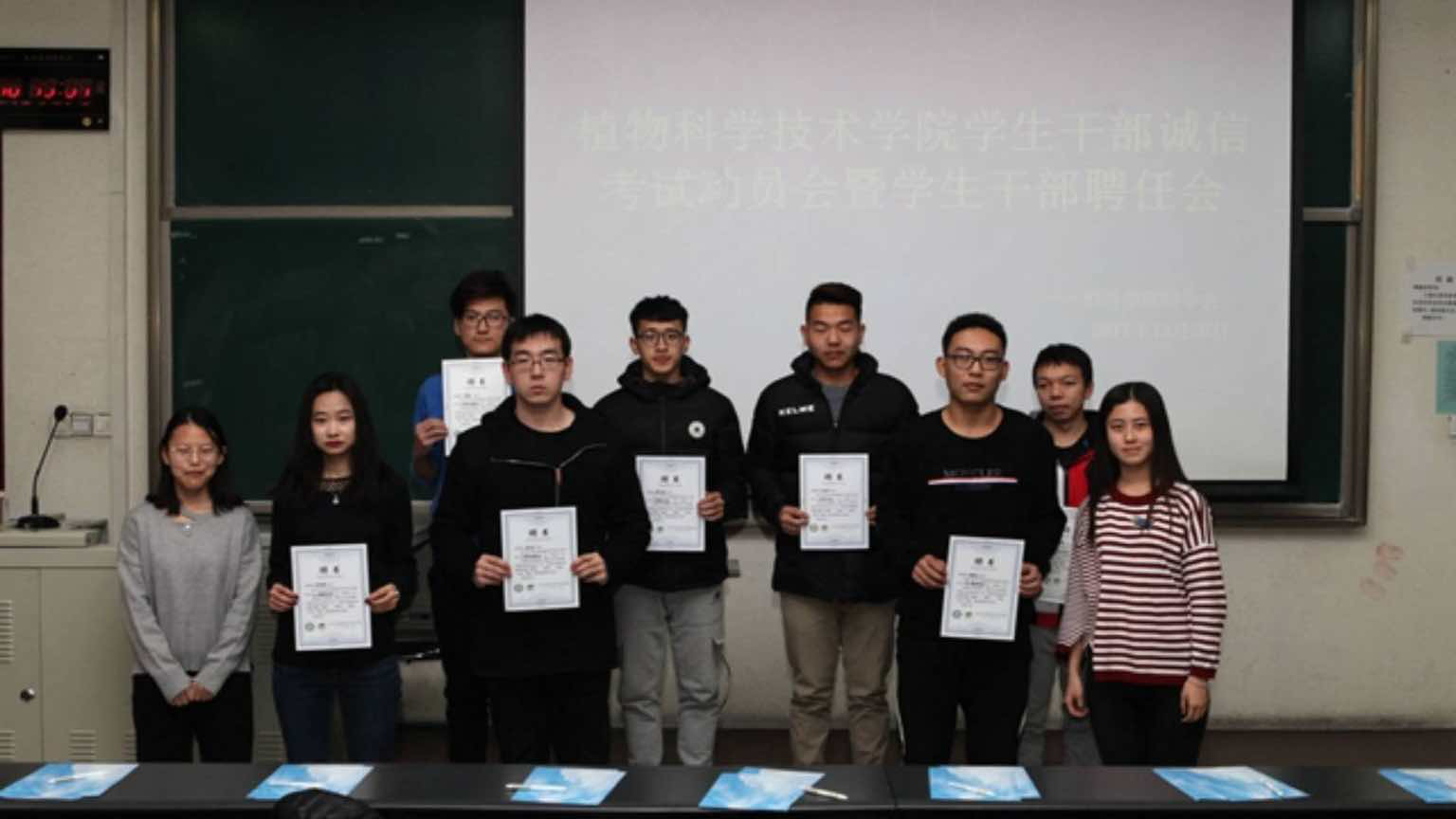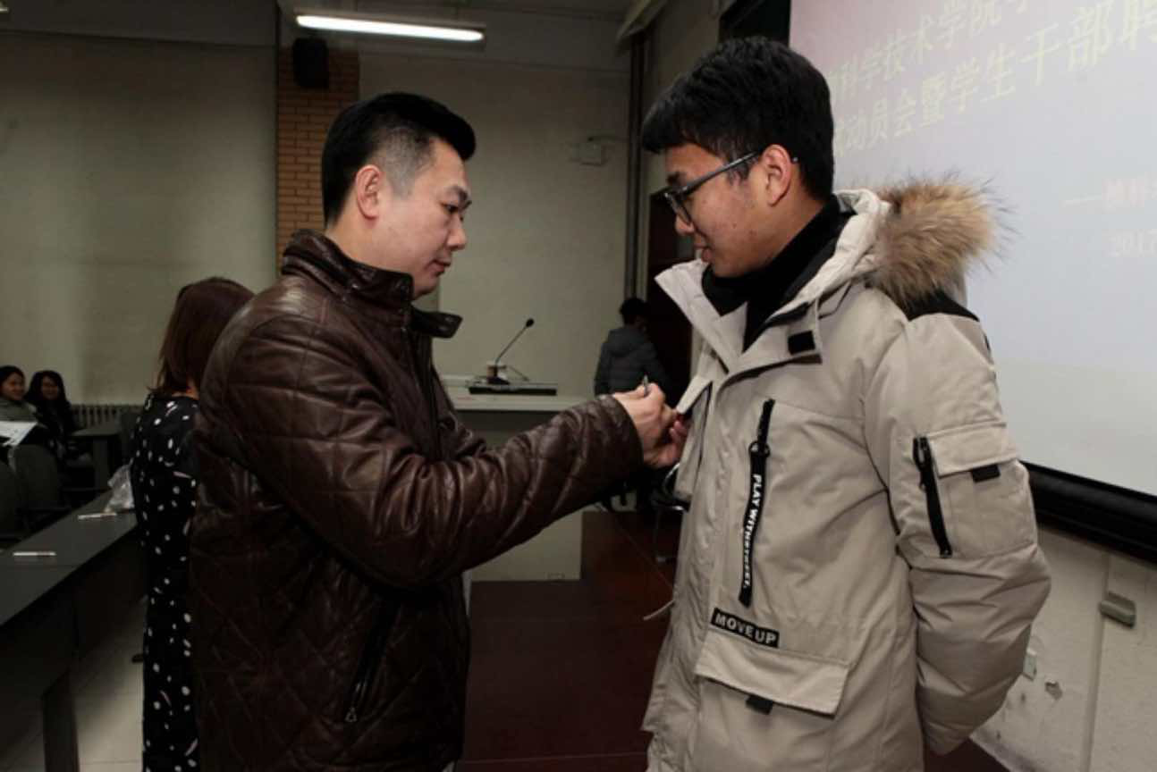 会议伊始,牛老师和郝老师为学生会主席团成员颁发学生干部徽章及聘书、两位老师及主席团成员为副部长及以上成员颁发聘书、并由学生会主席团成员为各班班长及班级代表、宿舍长及宿舍长代表颁发聘书。然后16级、17级班长上前签署了诚信考试承诺书,表达同学们诚信考试、积极备考的决心。