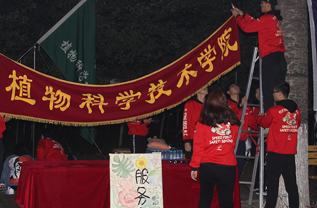 由体育部部长朱江媛带领体育部全体成员于10月20日早6:00到办公楼2号楼3031开始搬桌子、挂院旗,一切工作都井然有序的进行着。