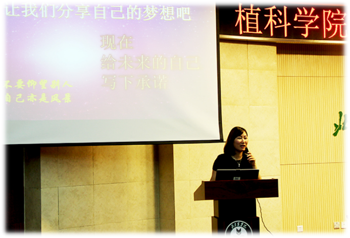 第二部分,由郝娜老师发表讲话,强调作为一名大学生,应该拥有丰富的业余生活,应该拥有自己的梦想。这让学生们意识到:梦想,是对未来的一种期望,是在现在想未来的事或是可以达到但必须努力才可以达到的情况,梦想就是一种让人感到坚持就是幸福的东西,甚至其可以视为一种信仰。同时郝娜老师认为同学们应该制定一个小目标,并为完成目标而努力,最终实现目标。