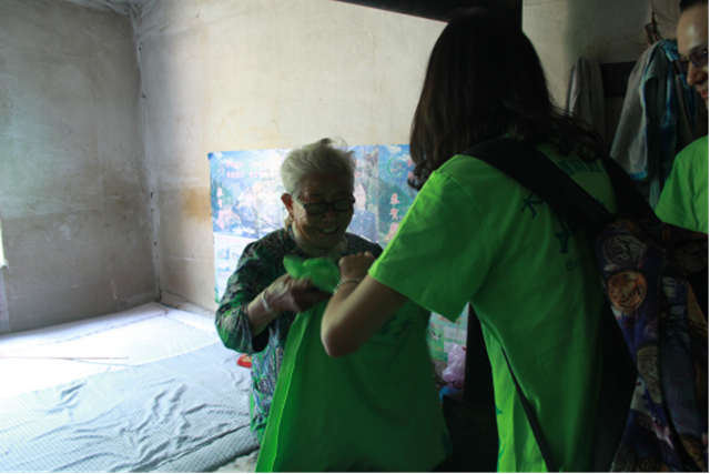 爷爷去世后,村里为奶奶办了低保,但是每月的低保补贴根本无法保证奶奶最基本的吃穿,于是她便自己动手编一些小篮子拿到村里的集市上去卖,当我们走进奶奶堆放编织材料的小屋子里时,大家的眼眶都禁不住泛起了泪花,奶奶的手因为编织时经常被绳子勒着,以致于出现了许多深浅不一的伤口。奶奶自己居住的小屋每次下大雨时都会漏水,自己又无能力改造,奶奶哭着对我们说:“没想到你们这群大学生还能来看我,我没有别的需求,只希望村里能把我这房子给修了。”