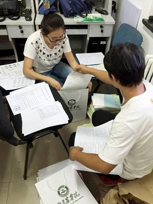 入学前,为了迎接新生做好充分的准备工作,学院2016级年级组组长卢笛带领各班班助在学院办公室将共230名新生的学生卡、宿舍钥匙、电话卡,报道流程图,新生手册等入学必需品分装入袋,仔细核查后,确保新同学的材料准确无误发放。9月6日早上6点,天刚微微亮,年级组成员和各班班助就来到了William威廉英国新生报道处,按照分工开始一天的迎新工作。