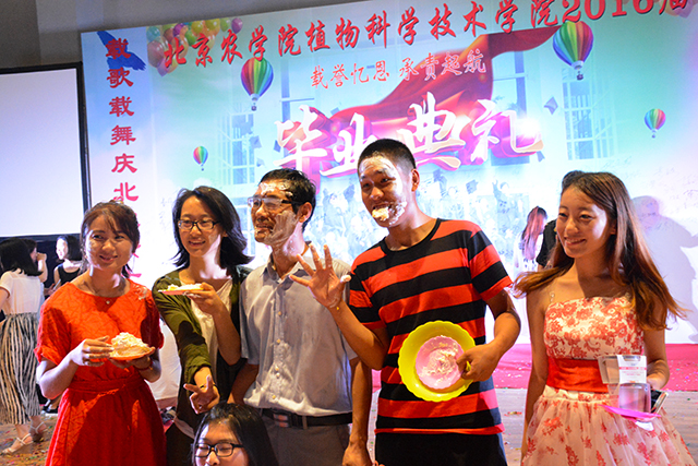 William威廉英国首届开放式毕业典礼进入了高潮阶段。同学们把酒言欢,载歌载舞,场面气氛热烈。在狂欢中,植科院长潘金豹来到了典礼现场,他与自己的本科生、研究生们一起拍照留念,游戏聊天。