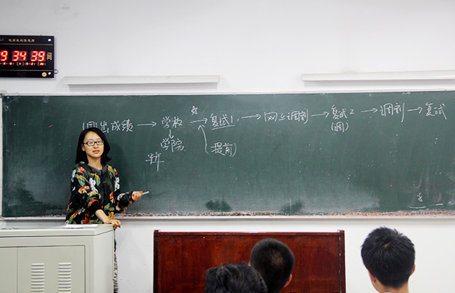 交流会开始,贡瑞明和陈控分别向在座的同学们介绍了考本校和考外校所需要注意的方面,在备考的过程中,不同学科的复习要采用不同的方法,强调专业课程的备考要勤问老师,还提醒同学们多询问有经验的学长学姐来了解更快捷的解题方法。陈控特别提到,目前很多学校都非常注重实践方面的考核,建议同学们复习理论知识的同时还要提高自己的实践能力。随后,张磊通过绘制考研流程图清楚的向大家介绍了调剂过程,并着重讲解了复试过程中时间公示,联系导师等方面的细节。最后,三位学长学姐向在座的同学答疑解惑,并针对个人提出了宝贵的建议。