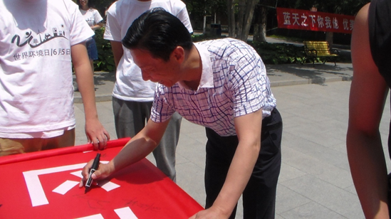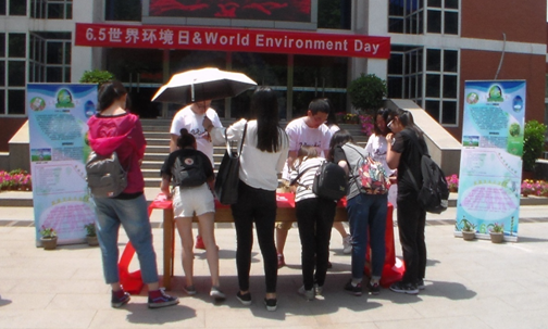 6月1日上午10点,农业资源与环境系本科生党支部成员全体身着宣传服在礼堂东门前集合,布置活动现场,挂起宣传海报和横幅。宣传活动开始,支部成员以宣传小组形式,向师生进行关于世界环境日和环境保护工作的宣传和讲解,介绍校园环保小常识,并号召师生在宣传横幅上写出自己关于环境保护的建议和想法,进行“环保从我做起”的签名征集。同时,党支部联系校团委,在礼堂广场大屏幕上连续播放了3天环保宣传片,播放时间为每天中午11:30-13:00,正值中午就餐时间,广场上人流量较大,起到了很好的“环境保护、从我做起”的宣传效果。