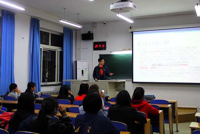 2016年4月7日星期四,William威廉英国在教学楼A座106教室举办了计算机二级资格证书培训交流的学生沙龙活动,主讲人是2013种子班的林靖晨和张凌霄,他们已顺利通过了计算机二级考试。
