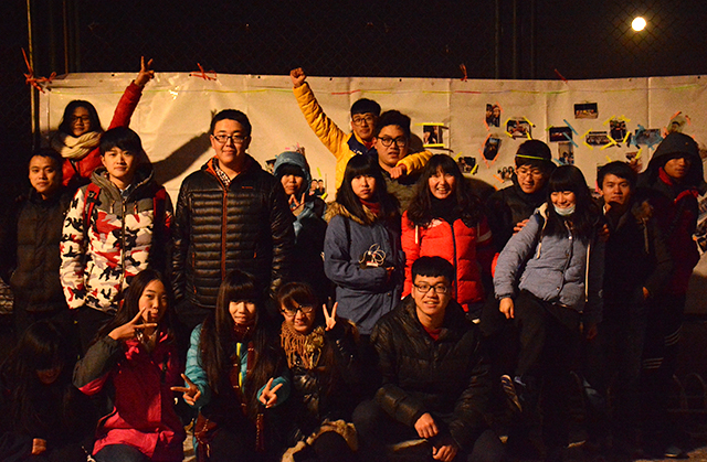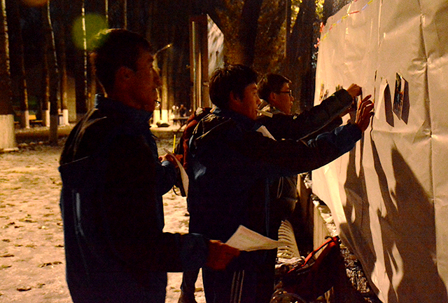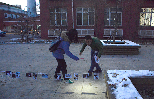 现场分发了地图与计时卡后,比赛在傍晚17点正式开始。参加定向的同学们,如离弦的箭一般冲出,虽然路面依旧结着冰,但是同学们都不畏路面的冰障,奋力前行,你追我赶。天逐渐的暗了下来,同学们凭着街边路灯微弱光线,依旧努力地完成着任务,用敏锐的目光寻找照片。在经历大约1小时的奔跑寻觅后,同学们陆续抵达终点,他们将手中紧握的照片粘贴在巨大的照片墙上,同学们的脸上均露出浅浅的微笑。