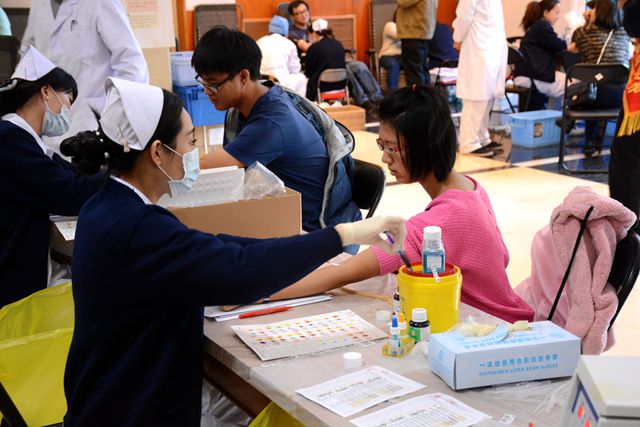 献血约在上午10点开始进行,献血过程中,献血的同学们纷纷排队按照要求填表、量血压和验血,老师们维持现场秩序,志愿者帮忙倒红糖水,帮助献血同学们慢坐慢起,一切工作都有条不紊的进行,把爱心和温暖传递了出去。