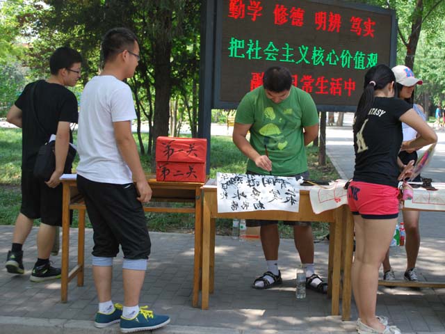 此次活动可谓是热闹非凡,成效卓越。参赛者们竞相答题,有的同学过五关斩六将还拿到了奖品,闯关失败的同学也不沮丧拿起毛笔一同感受中华文化的精髓。尽管很多同学第一次用毛笔时有点紧张,字也写的不好,但他们却爱上了书法,伏在案上写字,忘了离开,导致桌子都不够用了;还有热情的学姐拍毕业照合影留念;最终,由于学生们热情参与,忘却了时间,致使活动推迟了一个小时才结束,同学们仍意犹未尽,活动的目的及意义得到了充分展现。