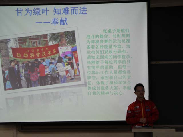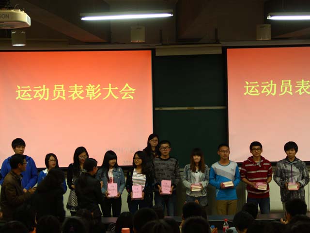 副院长赵宇昕对植科科学技术学院的体育工作做了一个简单的汇报。我们从过去距离第一名相差200多分,到了去年与第一名相差85分,而今年,我们拿到了第一,如同凤凰涅槃一般。今天的成绩和同学的付出充分诠释了我们植科精神“奉献、团结、进取、专业”的内涵。表彰会上,根据运动会期间的表现评选出了十名优秀运动员和十名优秀志愿者,赵宇昕宣读了获奖名单。