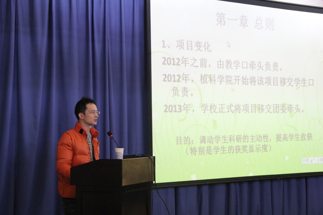 学生工作副院长赵宇昕就大学生创新计划实施情况进行了介绍,着重讲解了项目申报和实施过程中出现的问题和注意事项,明确了对学生和指导教师的要求。为了加强大学生创新计划实施工作的严格管理,我院要求学生必须按申报书工作计划完成工作任务,在项目验收时完成项目结题报告,并提交论文或专利或实验报告或调查报告或设计图纸等研究成果;教师也要提交指导学生的工作总结。学生还要参加结题答辩。国家级项目须参加挑战杯等学科竞赛。