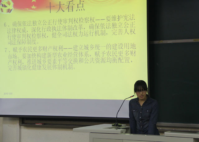 会上,团总支委员白爽围绕农村改革,反腐建设等十大看点进行解读,并对农村改革进行了深入剖析,深刻讲解了三个赋予,七个允许等十八大农村改革新动向。