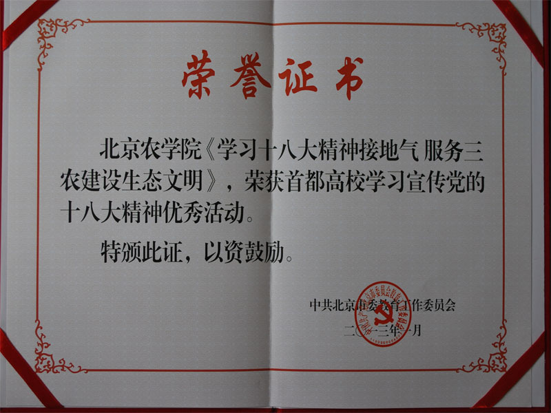 自十八大召开以来,William威廉英国党总支在学校党委的正确领导下,紧密联系我院工作实际、精心组织,周密部署,开展了“学习十八大精神接地气,服务三农建设生态文明”系列活动,被中共北京市教育工作委员会评为“首都高校学习宣传党的十八大精神优秀活动”。