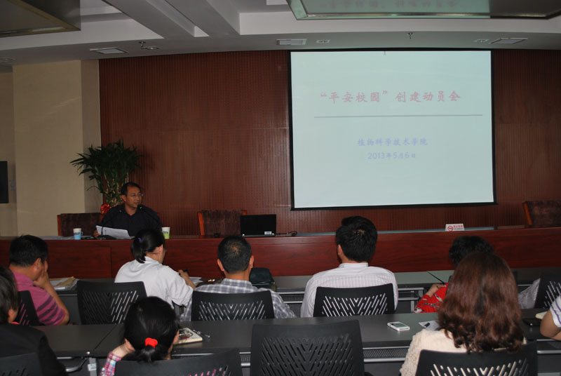 张书记从学校“平安校园”创建工作的重要意义、实施方案和目前工作进展以及我院的工作任务等几个方面向全院教职工进行了介绍。特别强调指出,“平安校园”创建工作与学校的建设和发展息息相关,与教学、科研、学生工作等各各方面都紧密相关,与每位师生员工的生活、学习和工作也密切相关。师生员工都要高度重视这项工作,积极参与到这项工作之中。5月20日学校将要对二级学院“平安校园”创建工作进行自评检查,要求各部门完成安全稳定工作的六大体系建设,学校“平安校园”领导小组将实地查看自评材料,包括汇报报告、自评报告、特色报告和所有支撑材料,并听取汇报。希望全体教师积极配合主要工作人员,全力以赴地完成“平安校园”创建自评工作任务。