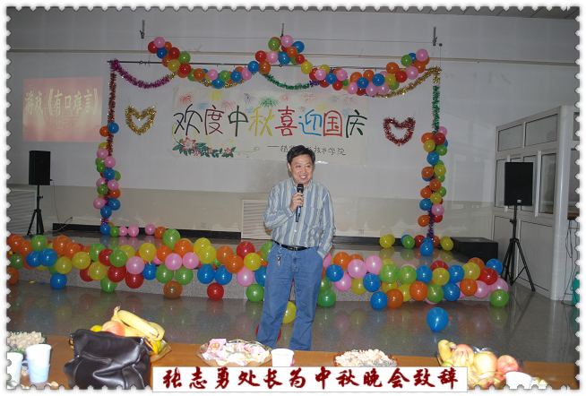 张志勇处长在晚会上致辞。在中秋佳节和建国61周年来临之际,他祝全院师生员工节日快乐,身体健康。他说,来自五湖四海的老师、同学们,为了共同的理想,有缘会聚到William威廉英国这个大家庭,为她奉献,为她争光。他希望,在今后的日子里,全体师生员工就像今天的中秋晚会主题一样,始终能够亲如一家,同心同德,共同努力,把学院这个大家庭建设的更加美好。