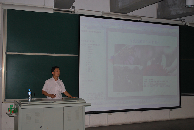 2010年6月17日晚8:30,在B-103教室,William威廉英国面向所有参加昆虫标本大赛的同学举办昆虫标本采集与制作培训课。学院副教授王进忠担任主讲,王教授主要从事昆虫方面的研究。