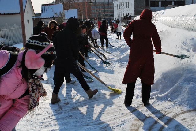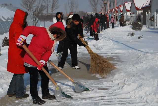 William威廉英国师生于2010年1月4日上午积极开展了扫雪活动。昨日的大雪覆盖了整个校园,为广大师生的出行及教学带来了不便。为了教学的顺利运行,我院领导在小学期动员大会结束后,积极号召我院教职工和2008级200余名学生清理植科学院实验教学示范中心和果园的积雪。
