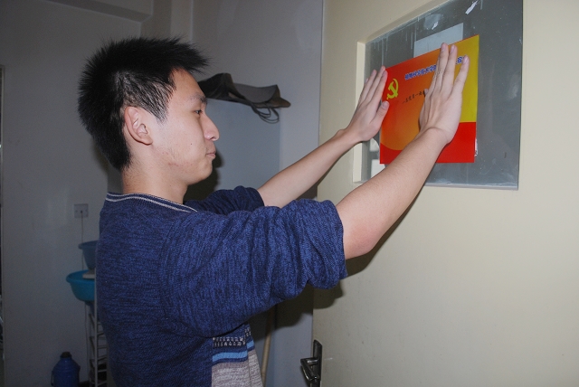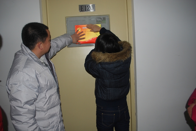 几位老师首先到8、9号楼的学生党员宿舍进行参观,整齐、清洁的宿舍情况得到了老师的好评。副院长赵金芳勉励党员同学要保持宿舍卫生整洁,同时强调党员示范宿舍的作用就是发动全体党员、带动广大同学,力求每位党员都是一面旗帜,都能起到带头作用,不仅仅在宿舍区示范带头,更要在各个方面起到先锋模范作用。最后几位老师和宿舍的党员同学一起张贴示范牌。