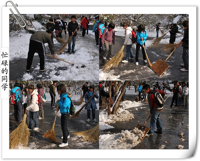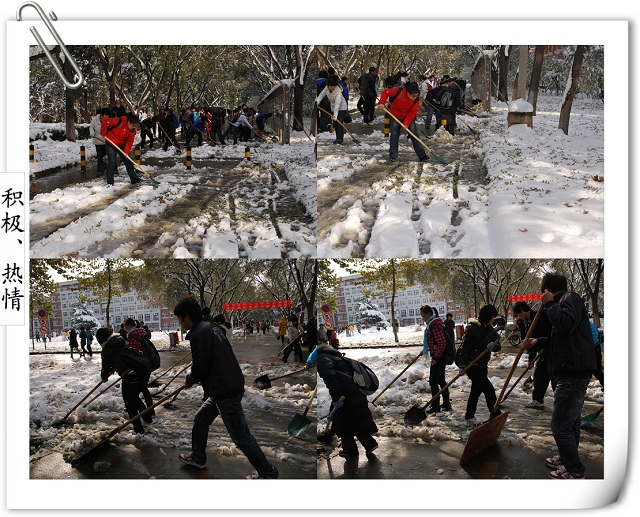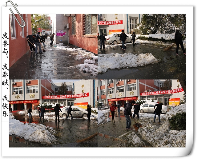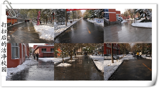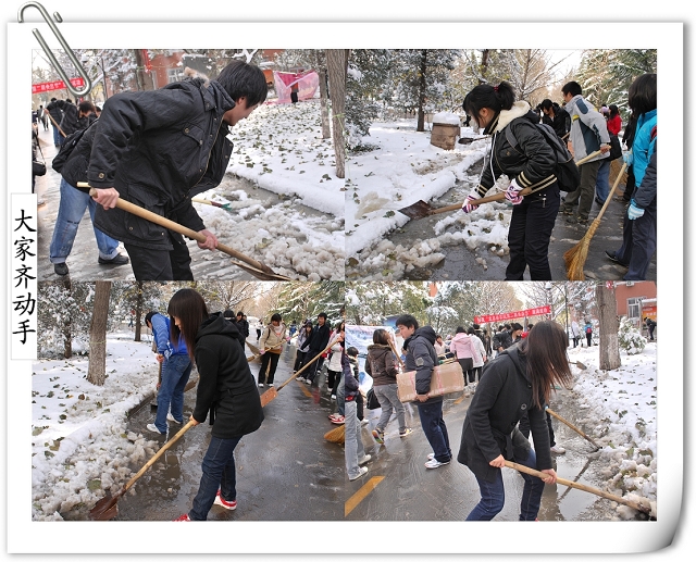 师生齐动员的场景引得路人的赞叹,同时得到后勤集团及学校个别部门的支持,为大家提供铁锹、铁锨、扫把等工具。争先恐后、你帮我扶,在大家半个小时的努力下,通往办公楼的南北路、去往一二食堂的大道小路、图书馆门前,变得畅通无阻,消融的积雪不再侵蚀师生的鞋子,而成为树木的最好浇灌积水,灿烂的笑容、师生互助的情景,成了今天别样美丽的风景线,更多的是为全校师生的工作和学习带来了方便。