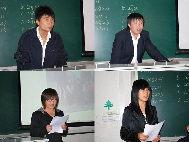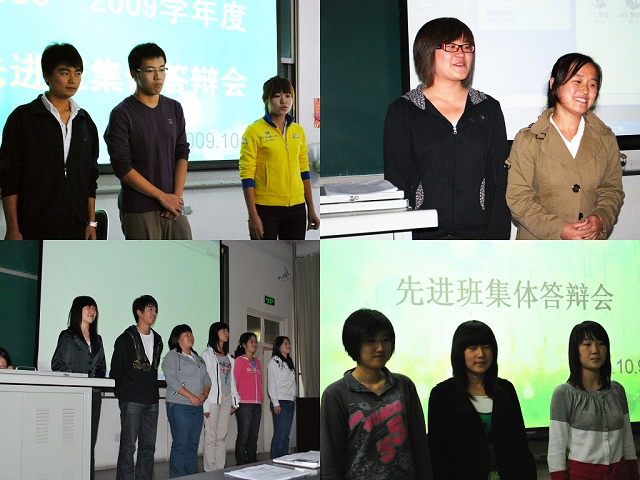 答辩会由院学生会主席齐岩主持,马淑芹、贾慧敏、邬瑞杰三位老师及各班负责人担任评委,先进班集体评选活动主要从政治思想、道德品质、心理健康、学习成绩、工作效果、语言表达等几个方面进行评比。通过初选的2006-2008级8个竞选班的班委以演讲、幻灯片、视频展示等方式展现本班一年来的风采,并回答了评委老师的提问,以表达本班级团结进取的决心,充分展示出同学们努力拼搏、热爱集体的良好风尚。