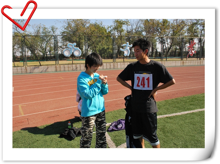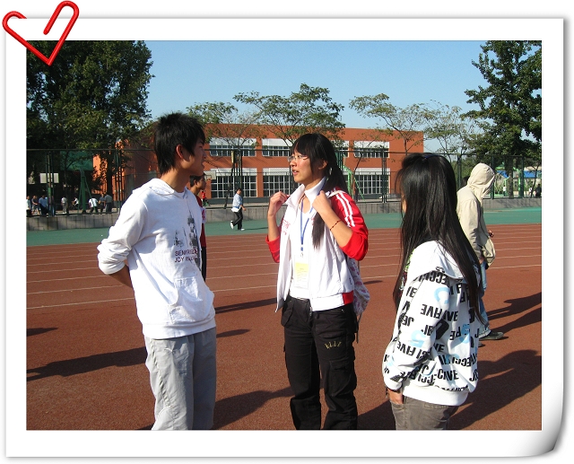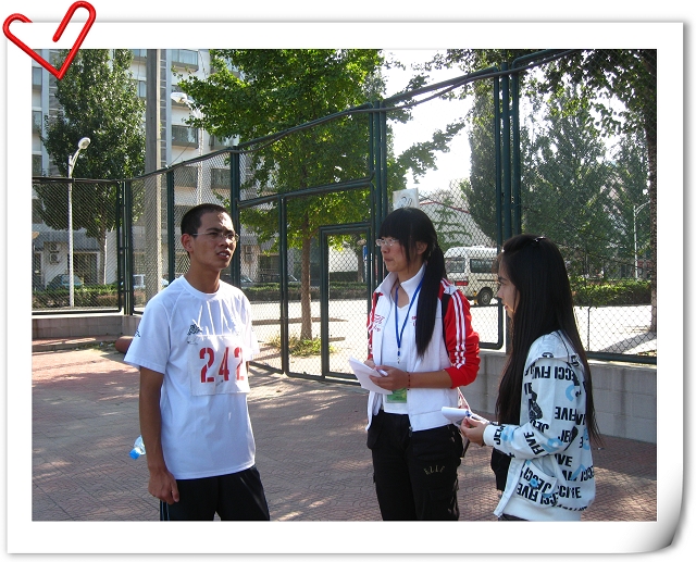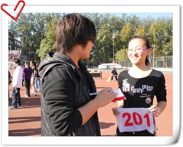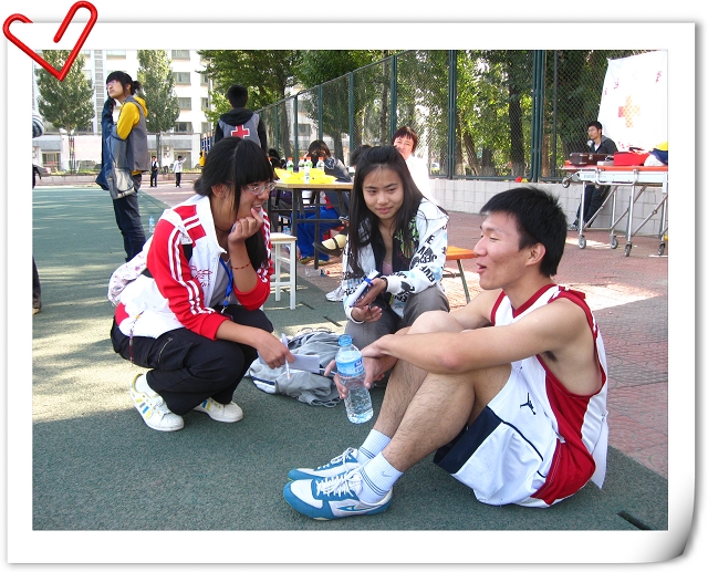 没有参加比赛的同学在看台上不停地为运动员加油,他们的声音在运动场上徘徊,鼓舞着运动健儿。院体育部的工作人员和同学们为运动员服务。曾看到这样一个场景,一个人握着运动员的手说:“怎么这么凉啊!不要紧张,来捂捂,跑第几都没关系,尽力就好了……”也看到运动员跑完后腿抽筋,有院里的同学帮着拍打,压腿,扶着走路,询问还痛不痛。比赛完后我们都能听到这样的话:喝点水吧;刚跑完不要立刻就坐下,我扶着你走走;腿是不是很软;你刚刚真是太出色了;哇,好厉害,给你揉揉肩……好似一家人,是兄妹姐妹!