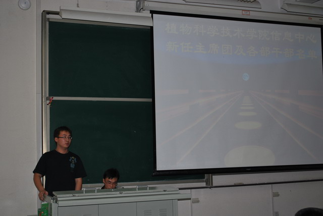 技术部新任部长宋鹏主持大会,并在特别的日子代表信息中心所有成员为与会老师送上节日的祝福。会上首先播放由技术部制作的信息中心宣传视频,将新老成员的特制工作照一一展示,并宣布新一届主席团成员名单。之后原信息中心主任丁宝力总结了一年来的工作情况,新成员代表杨毅松也与全体成员表态将以更新的面貌展示植科风采。此外本次换届大会宣布成立了新闻专题报道组和外联组,使我院信息中心的队伍更加壮大,工作逐步迈上新台阶。