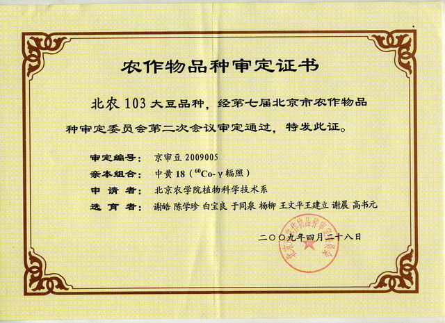 我校大豆课题组谢皓、陈学珍、白宝良、于同泉、杨柳、王文平、王建立、谢晨、高书元等科技人员育成的大豆品种“北农103”于2009年4月28日经北京市农作物品种审定委员会审定通过,这是继“北农101”之后又一审定通过的具有自主知识产权的大豆新品种。