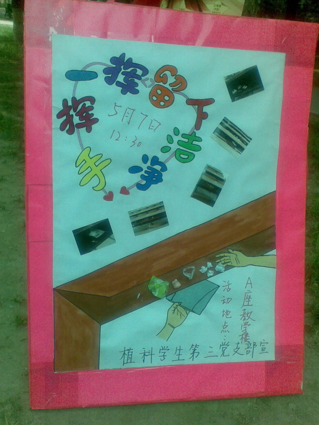 2009年5月7日中午12:30,为更好的践行科学发展观,加强教室环境的整洁,保持良好学习环境。植物科技学院学生第三党支部党员及积极分子举办“挥一挥手,留下一片洁净”党日活动,将我校教学楼A座开放的教室,集中打扫、收捡垃圾,以期通过行动向全体同学发起倡议,共同爱护共公设施,保护环境,养成良好的习惯。