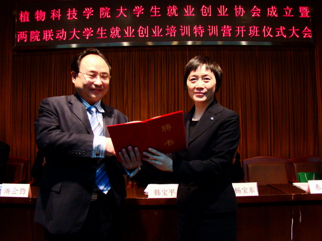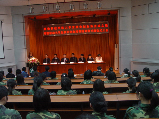 2009年3月28日上午9时,植物科技学院大学生就业创业协会成立暨大学生就业创业培训特训营开班仪式大会在小报告厅隆重举行。中国农民大学教授张斌国、中国农民大学联合创业学院黄鹏程等6位高级培训师、校党委学生工作部部长韩宝平、校团委书记杨宝东、植物科技学院党总支书记潘金豹、院长秦岭、副院长赵金芳出席大会,院辅导员马淑芹、牛奔、贾慧敏及全体协会会员参加了大会。辅导员助理邬瑞杰主持大会。