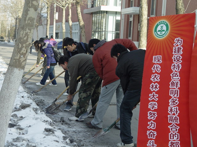 207211班30多名学生,积极踊跃,不怕冷,不嫌累,将办公楼一二三四楼的交通干道、以及师生们经常走过二食堂附近的道路和研究生试验楼前后道路的积雪,一一清除。一张张冻红的小脸洋溢着劳动的快乐,也给师生的出行提供方便。