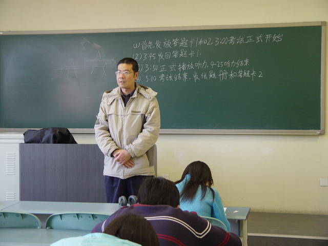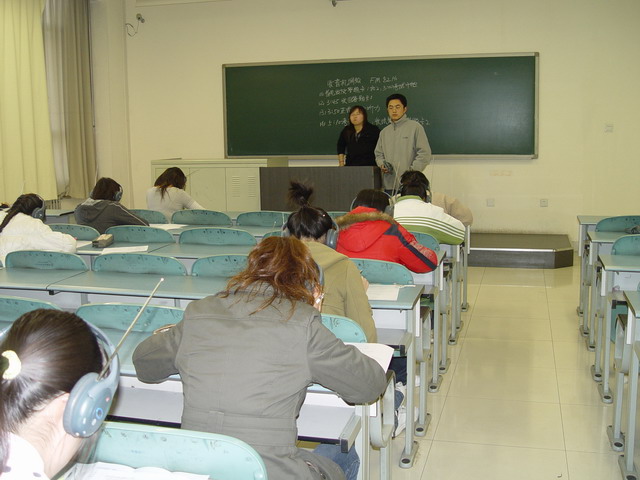 此次考试从考前准备(准考证、考场安排、考场座位安排等)、考试过程(入场、考试时间、听力播放)、监考老师须知等全部按照四级考试形式进行。考试分设八个考场,监考老师均经过考前培训、指导。