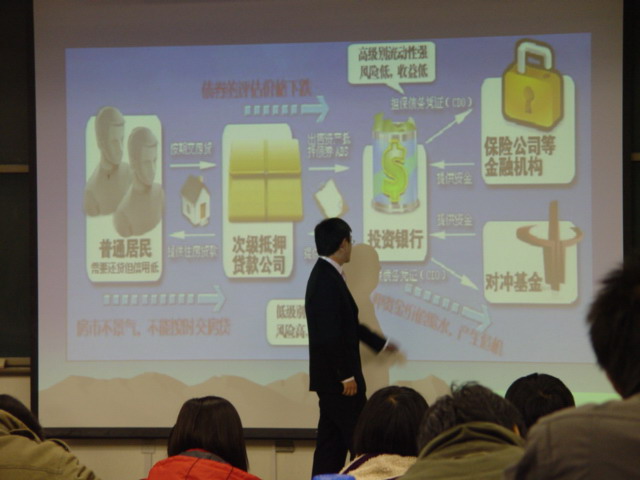 刘先生就当前美国华尔街金融危机与1929年曾经爆发的全球金融危机进行了对比分析,以一张生动丰富的图画,向在场的同学们解答分析了此次爆发金融危机的主要和根本原因是美国的金融政策和美元的大量发行造成的。李先生将当前的理财理念分为基础理财、保资理财、投资理财和投机理财四个部分,就当前的局势为大学生如何理财作了细致的引导和规划。在场的同学提到很多理财上遇到的问题,刘先生耐心解释,并为一些在炒股和将要准备创业的同学作了指导。
