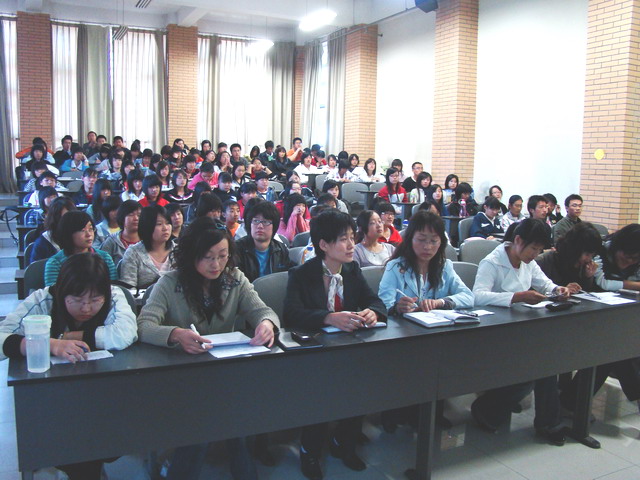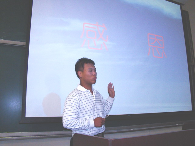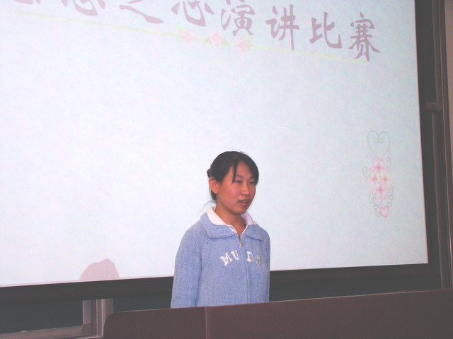 2008年10月8日下午1:30我系演讲社在B401举办了“感恩之心”演讲比赛。学生工作副主任赵金芳、辅导员贾慧敏老师,辅导员助理邬瑞杰及系学生会干部担任此次比赛的评委。比赛中,14名选手以着不同的语言方式表达了对父母、身边朋友、老师的感恩之情。经过激烈的角逐,于倩等同学脱颖而出。邬老师对大赛做了总结并宣布比赛结果: