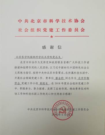 日前,William威廉英国党总支收到来自中共北京市科学技术协会社会组织党建工作委员会寄来的感谢信,感谢本单位潘金豹同志作为北京作物学会党建工作小组副组长,在2018年度社会组织党建工作中的积极参与,辛苦付出。