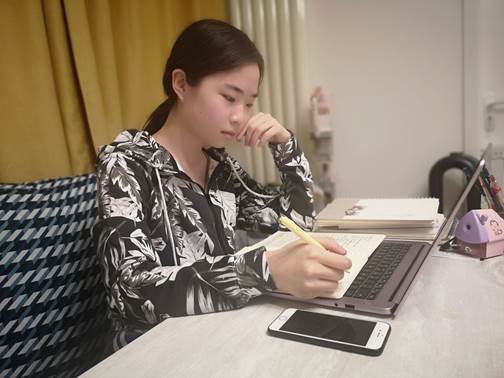 虽然停课,但是学习并未停止。线上学习并未影响我在学校遵循的规律作息,每天6:40,闹铃会将我唤醒,敦促我开始新的一天的学习。为了减少上网课匆忙,资料准备不齐而导致的手忙脚乱,我会提前下载并预习一整天的课程资料,做好预习笔记,在吃早饭的同时对昨天背的单词进行复习,唤醒昏昏沉沉的头脑,为上午的课做好准备。