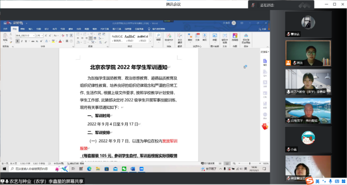 为确保2022级新生安全有序顺利入学报到,2022年8月28、29日,2022级班主任和班主任助理在线上召开第一次新生主题班会。会上,班主任为新生解读《2022-2023学年秋季学期学生返校到校通知》,叮嘱学生做好开学前准备,按时健康打卡监测,提醒学生途中做好个人防护,同时也解答了新生们对大学生活中的疑问。新生们在感受到植科学院热情的同时也提高了疫情防范意识,第一次主题班会为新生疫情安全防控垒砌第一道坚固防线。