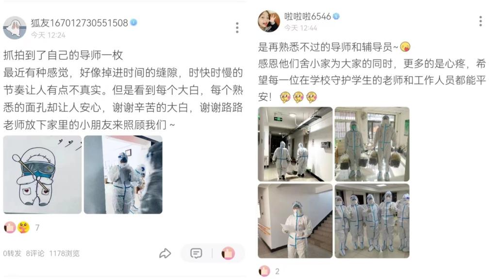 此时此刻,美好的语言也无法表达学生对老师的爱。在此想对她说一声:您辛苦了,谢谢您!同时十分感谢陪在我们身边的所有老师和学校的工作人员。愿我们共同努力,全体师生一起抗疫,守护好我们的校园,守护好我们这个共同的家;愿疫情早日结束,愿老师们能够回到家中好好休息;愿我们齐心协力度过这段时光,恢复美好的校园生活!