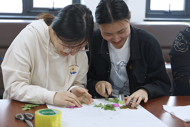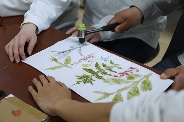 学生党员卢超凡向参加活动的师生党员讲解植物敲拓染这一非物质文化遗产的历史和知识,介绍所需材料、工具、制作流程及注意事项。了解植物敲拓染过程后,师生党员们开始挑选树叶、花朵,整理叶片,均匀铺开,再用胶带将植物进行固定,通过“一锤一石”把植物的自然形状、色彩、纹理拓印在方巾上。