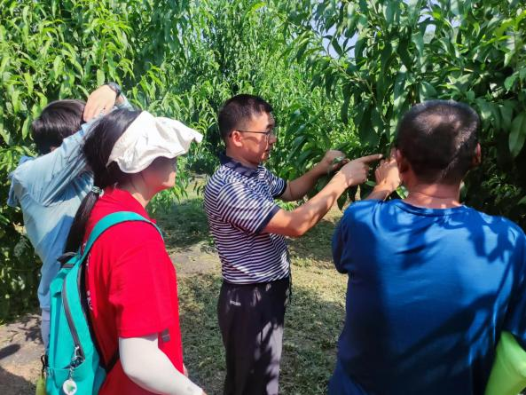 图四曹庆芹老师带领学生调查试验桃成熟情况