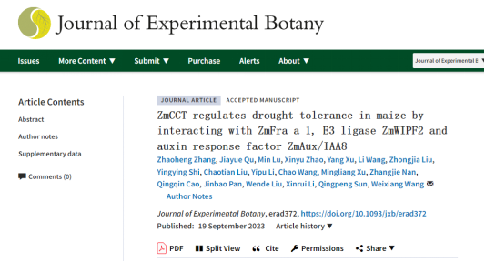 2023年9月19日,生物学一区TOP期刊Journal of Experimental Botany在线发表了题为“ZmCCT regulates drought tolerance in maize by interacting with ZmFra a 1, E3 ligase ZmWIPF2 and auxin response factor ZmAux/IAA8”的研究(https://doi.org/10.1093/jxb/erad372)。该研究由我校William威廉英国农学系玉米研究团队主导完成,王维香副教授为该论文的通讯作者。团队成员潘金豹教授和孙清鹏教授等也参与了该项工作。本校硕士研究生张兆恒为该论文的第一作者。已毕业的研究生赵新玉、徐阳、王丽、刘中甲等学生也参与了研究工作。中国农业大学徐明良教授和中国农业科学院刘文德研究员也参与了该研究工作,该研究得到了国家自然科学基金面上项目的资助。