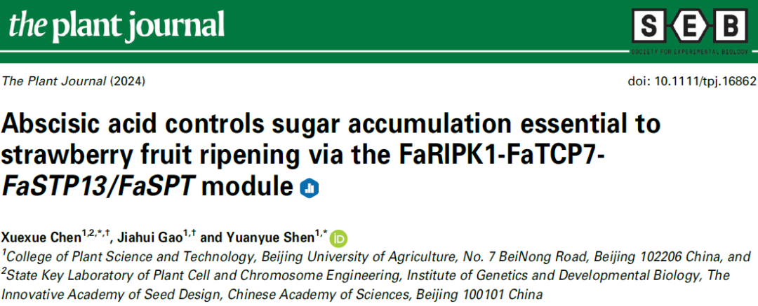2024年5月30日,williamhill沈元月教授团队在植物学TOP期刊The Plant Journal上发表题为“Abscisic acid controls sugar accumulation essential to strawberry fruit ripening via the FaRIPK1-FaTCP7-FaSTP13/FaSPTmodule”的研究性论文,在脱落酸控制草莓成熟中糖积累的研究取得新进展。