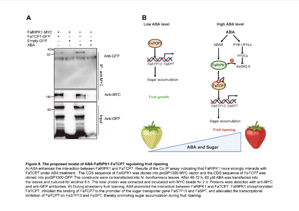 在果实生长阶段,ABA水平较低,FaTCP7结合糖转运基因FaSTP13和FaSPT的启动子抑制其表达及糖积累。在果实成熟过程中,增加的ABA水平通过ABA受体核心组分及蛋白磷酸化信号放大,FaRIPK1磷酸化FaTCP7,解除了FaTCP7对FaSTP13和FaSPT表达抑制,激活了糖载体基因的表达,促进了糖积累和果实成熟。