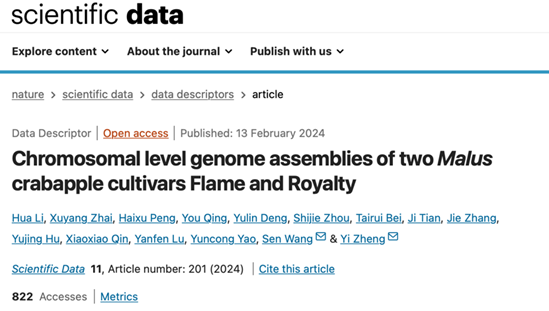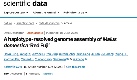 3. 2024年6月,williamhill郑轶团队在Scientific Data(IF=9.8)上发表了题为“A haplotype-resolved genome assembly of Malus domestica Red Fuji ” 的研究论文,在染色体水平上解析了栽培苹果红富士的基因组。