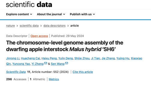 2. 2024年6月,williamhill郑轶团队联合山西农业大学果树研究所蔡华成副研究员在Scientific Data(IF=9.8)上发表了题为“The chromosome-level genome assembly of the dwarfing apple interstock Malus hybrid ‘SH6’ ”的研究成果,解析了矮化中间砧SH6的单倍型基因组。