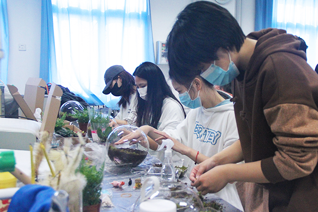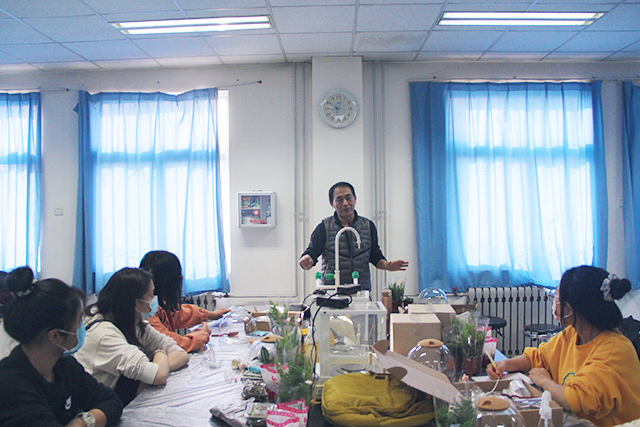 活动伊始,学院教师陈原为大家介绍植物微景观的概念、元素组成、设计思路和制作过程。接着在老师的示范和指导下,支部党员、积极分子用手中的工具,倒入轻石、铺入水苔、喷湿水苔、倒入泥炭、喷湿泥炭、种植植物、填塞苔藓……所有动作一气呵成,构建出妙趣横生的小世界。