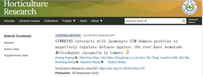 近日,Horticulture Research上线了(Advance Access)williamhill王绍辉教授团队题为SlWRKY45 interacts with jasmonate-ZIM domain proteins to negatively regulate defense against the root-knot nematodeMeloidogyne incognitain tomato的研究论文,该论文揭示了转录因子SlWRKY45参加茉莉素合成和信号转导途径负调控番茄对南方根结线虫的抗性。