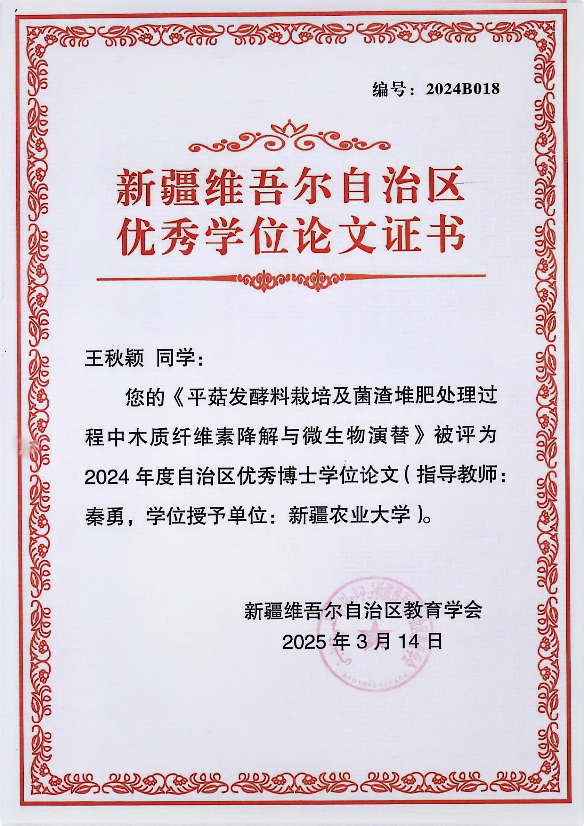 近日,新疆维吾尔自治区教育厅公布2024年优秀学位论文评选结果,williamhillWilliam威廉英国2024届联合培养博士王秋颖的学位论文《平菇发酵料栽培及菌渣堆肥过程中木质纤维素降解与微生物群落演替》成功入选。该论文由williamhill张国庆教授与新疆农业大学秦勇教授联合指导完成。